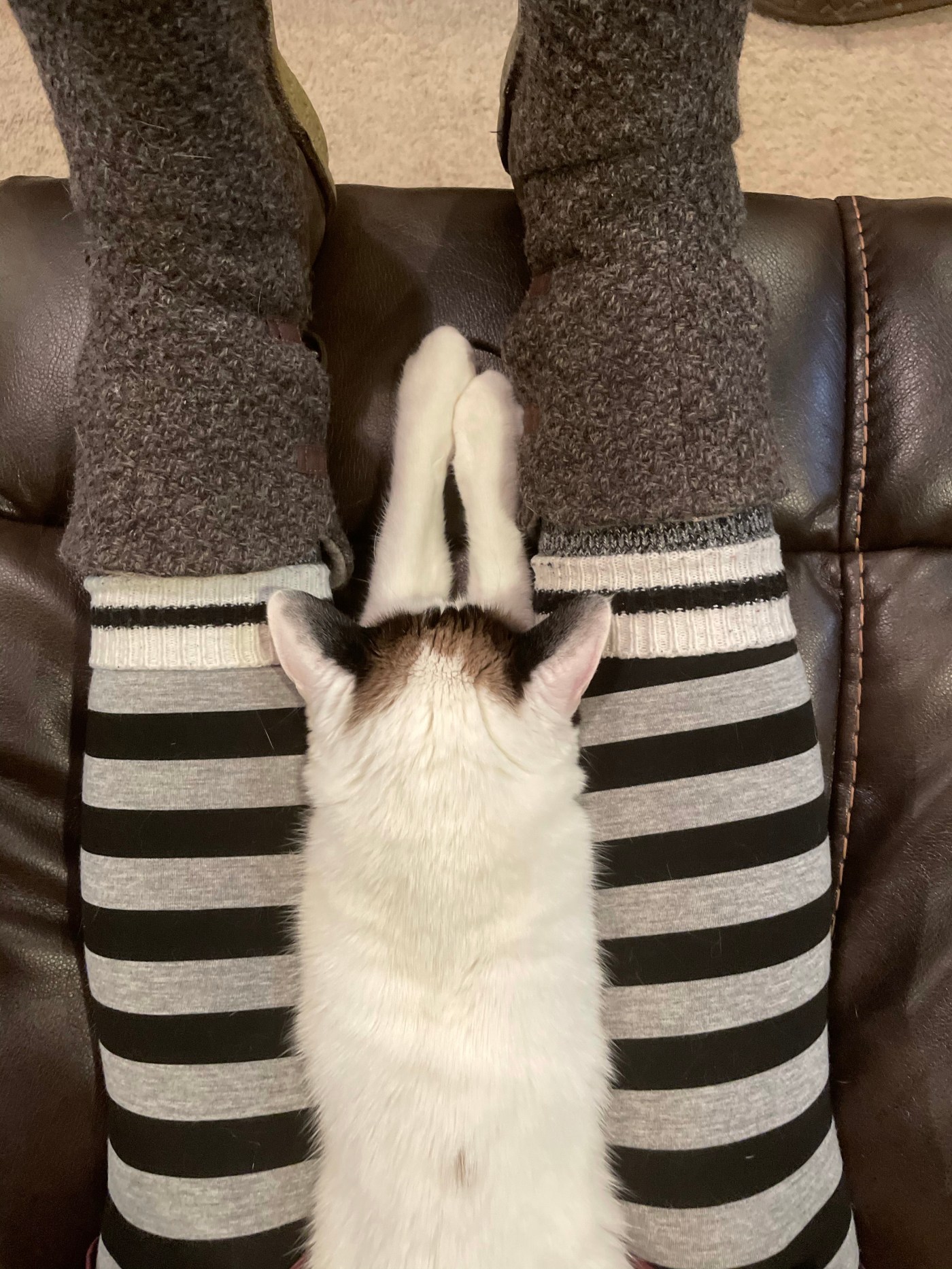 The cat is an essential accessory. She is my constant shadow and companion, and yes, those leggings are my favorite. They earned an unfortunate nickname thanks to my teenage daughter who calls them my Beetlejuice leggings, perhaps I should find a few more!